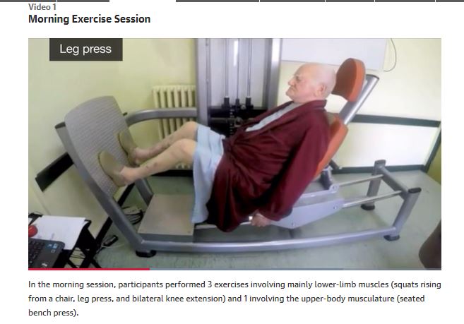 Pero es que no sólo hay que hacer ejercicio en domicilio o en la residencia, sino sobretodo en el hospital. Y esta creo que es una de las bases fundamentales de la geriatría. Pero no lo digo porque sí. Como bien nos recuerda este editorial, el ejercicio durante la hospitalización es básica para evitar la discapacidad iatrogénica nosocomial, deterioro funcional, inmovilidad o como quieras llamarlo. Y con ejercicio no se refieren a hacer pesas, que también, como bien demuestra el trabajo de Martínez Velilla también se puede hacer, sino algo tan difícil y sencillo a la vez como caminar y levantarse de una silla durante unos 20 minutos al día. Lo que sea con tal de no estar sentado todo el día como pasa, por desgracia, en muchas ocasiones, y más ahora con todo esto de la COVID. Esto tan sencillo parece que no sólo mejora el riesgo de inmovilidad y de acabar en una residencia, sino que también disminuye el riesgo de morir, tanto durante la propia hospitalización como tres meses después del alta.