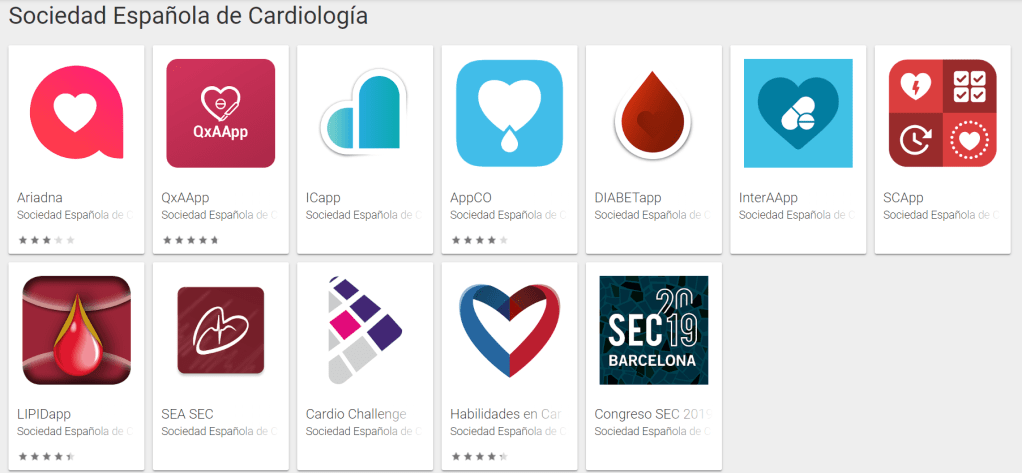 De cardiología hay algunas aplicaciones muy bien realizadas por la SEC, destacando QxAApp (para manejo perioperatorio y periprocedimiento de anticoagulantes/antiagregantes), ICapp (para insuficiencia cardiaca aguda en urgencias). Otra app interesante es Pacemaker para identificar el tipo de marcapasos