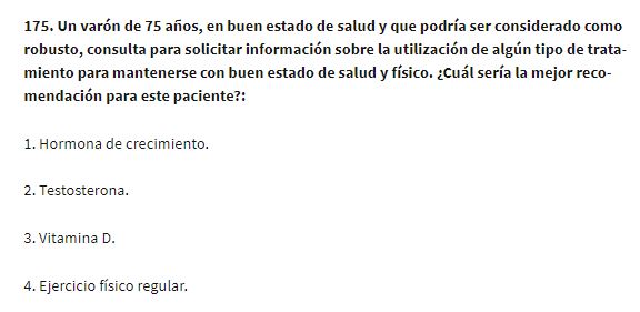 Pero para conseguir esto se necesita reconocer algo que es básico y fundamental. Y es, que la persona mayor no sólo no puede, sino que TIENE Y DEBE HACER EJERCICIO. Sé que ya os he hablado alguna vez de esto aquí mismo, pero de vez en cuando es bueno ser pesado y repetirse para no olvidar algo que es tan vital. Una muestra de esta importancia es el último examen MIR donde se reconoce esto. También hay que decir que visto lo visto con la famosa pregunta sobre la eutanasia tampoco es mucho decir que salga en el examen MIR.