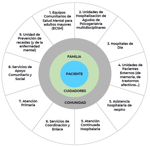 Después de leer estos datos, una se pregunta qué podemos estar haciendo al respecto. Se trata de un auténtico problema en una sociedad cada vez más envejecida en la que hay una alta prevalencia de trastornos psiquiátricos y neuropsiquiátricos, con todas las consecuencias que conllevan a nivel individual, social y económico. La Organización Mundial de la Salud (OMS) y la Asociación Mundial de Psiquiatría (AMP) se hicieron eco de esta preocupación y en 1996 definieron la “psiquiatría geriátrica”, “gerontopsiquiatría” o “piscogeriatría” (rama de la psiquiatría dedicada a la atención multidisciplinar de la salud mental de personas en edad de jubilación y por encima de ésta que puede variar según los países y las prácticas locales. Se caracteriza por su orientación comunitaria y su aproximación multidisciplinar a la evaluación, diagnóstico y tratamiento); en 1997 elaboraron un documento de consenso sobre la organización de la asistencia psicogeriátrica donde establecieron los principios de dicha asistencia (integral, accesible, ágil, individualizada, transdisciplinar, responsable y sistémica), así como los componentes del entorno para su aplicación basado en un sistema de atención continuada (Figura 1).